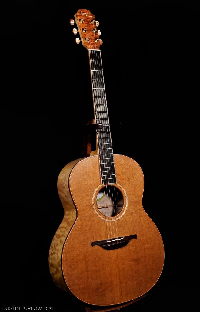 A very unique 2000 Lowden F35! This wonderful guitar features a cedar top over a mind blowing set of Quilted Maple. It has the early Lowden spec’s (nut: 1.75 , saddle: 2-3/16″) and has a very clear, bell-like voice. This guitar is perfect for the singer-songerwriter that doesn’t want the overwhelming bass of rosewood, but still looks for the sweet trebles of cedar.