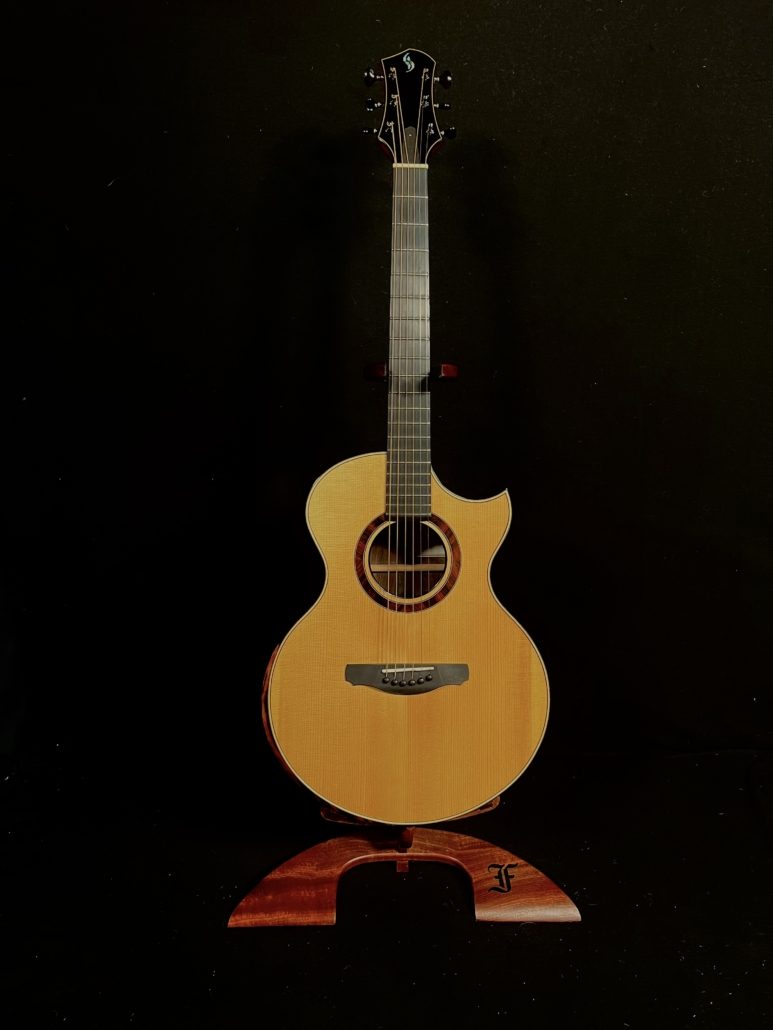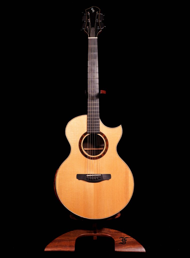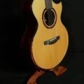 Just in to Cedar Fock is this rare pre-owned 2011 FE Grand Fingerstyle. This is a finger style players dream and is exceptionally loud! The Brazilian Rosewood has amazing figure -The sides are absolutely stunning! The tight waist and extreme back arch maximize interior volume while maintaining excellent ergonomics. The Adirondack Spruce pairs perfectly with the Brazilian, giving you everything you want in warm rich, robust sound. The mid ranch strings are even with the bass and treble – this guitar is very sonically balanced. The cutaway provides easy access to the upper frets and the MicroBevel® provides wonderful playing comfort. It has an ebony fretboard, bridge and headstock plate. The back of the headstock is graced with Macassar Ebony. The top is complimented with a matching wood rosette and rosewood soundboard purfling. You can feel confident tuning with the rock solid and smooth Gotoh 510 machines with polished graphite buttons. This guitar also features the Schenk Guitar proprietary Super-Rod trussed system for micro-adjustability and a stiff neck! This guitar is dressed with body and headstock maple purfling and maple soundboard purfling. The soundhole is wrapped in a genuine ebony circlet. As an extra bonus, this guitar features the ISD Tuner – Integrated Side Dot Tuner. Access hardshell case included.