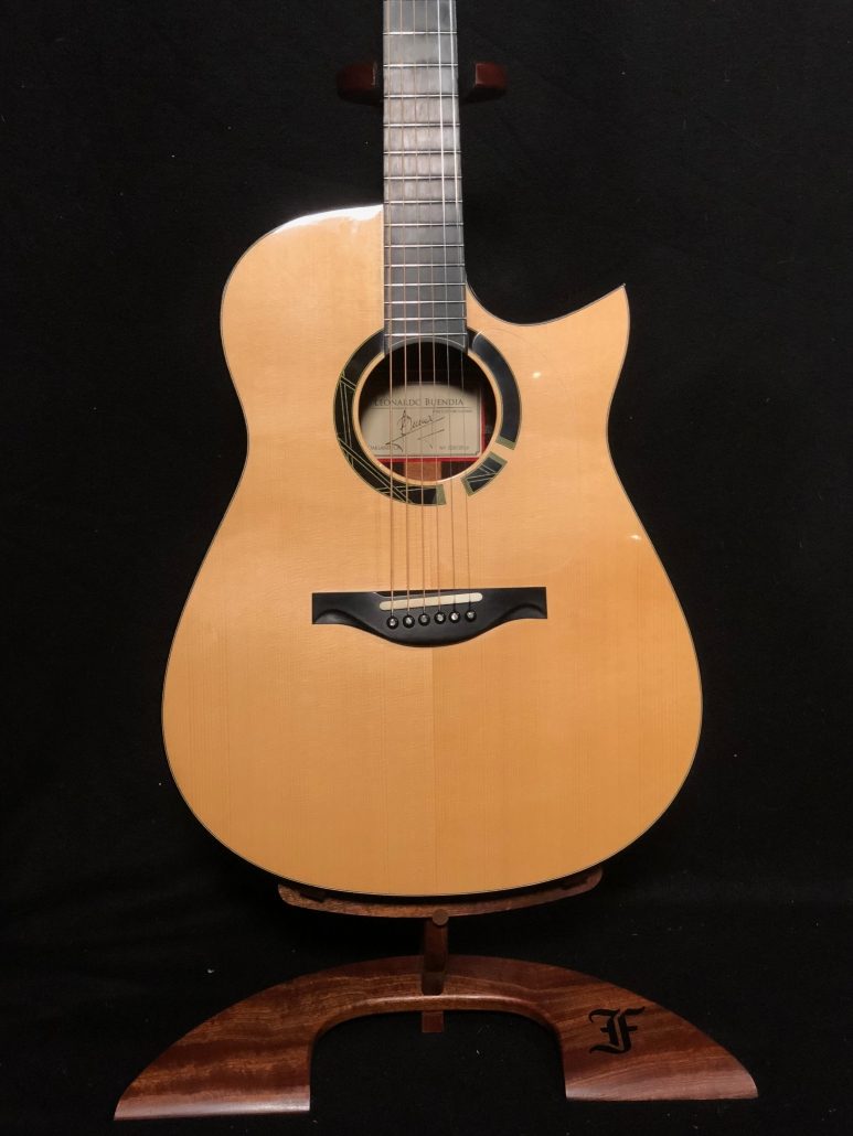 Just in to Cedar Rock is this fabulous Buendia with a stunning set of Wedge back and side wood with a Engelmann Spruce top. Anyone who knows Ervin Somogyi’s work will immediately recognize this Modified Dreadnought (Mod-D) design. The waist is nipped in the manner of a classical and shifted further forward compared to a standard dreadnought. Because the waist is higher up on the instrument, shifting its center of gravity and making it easier to balance and providing the player with a more comfortable playing position. This innovative model remains a mainstay of artists who require acoustic volume without compromising the quality of higher frequencies. We are always blown away by Leo’s attention to detail on his build, and this one just proves that once again. The tone is huge with that Somogyi low end depth and the trebles are silky smooth. This one a lifetime keeper.
