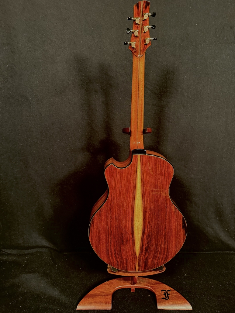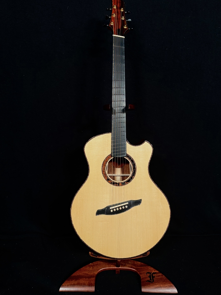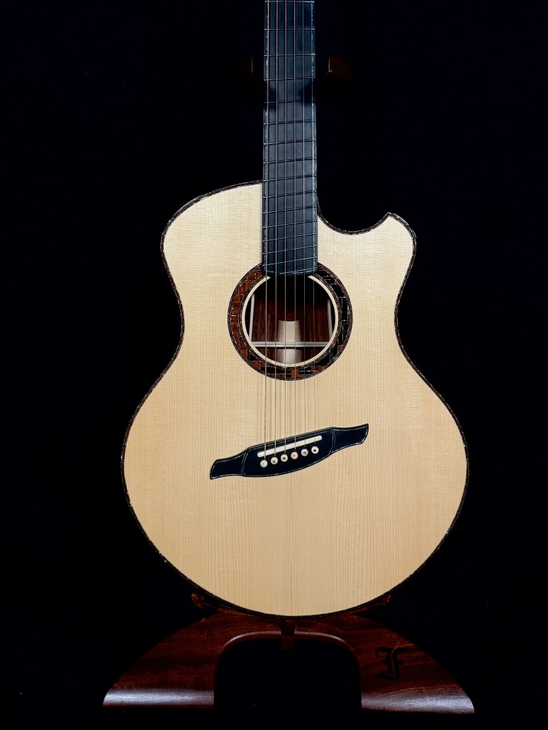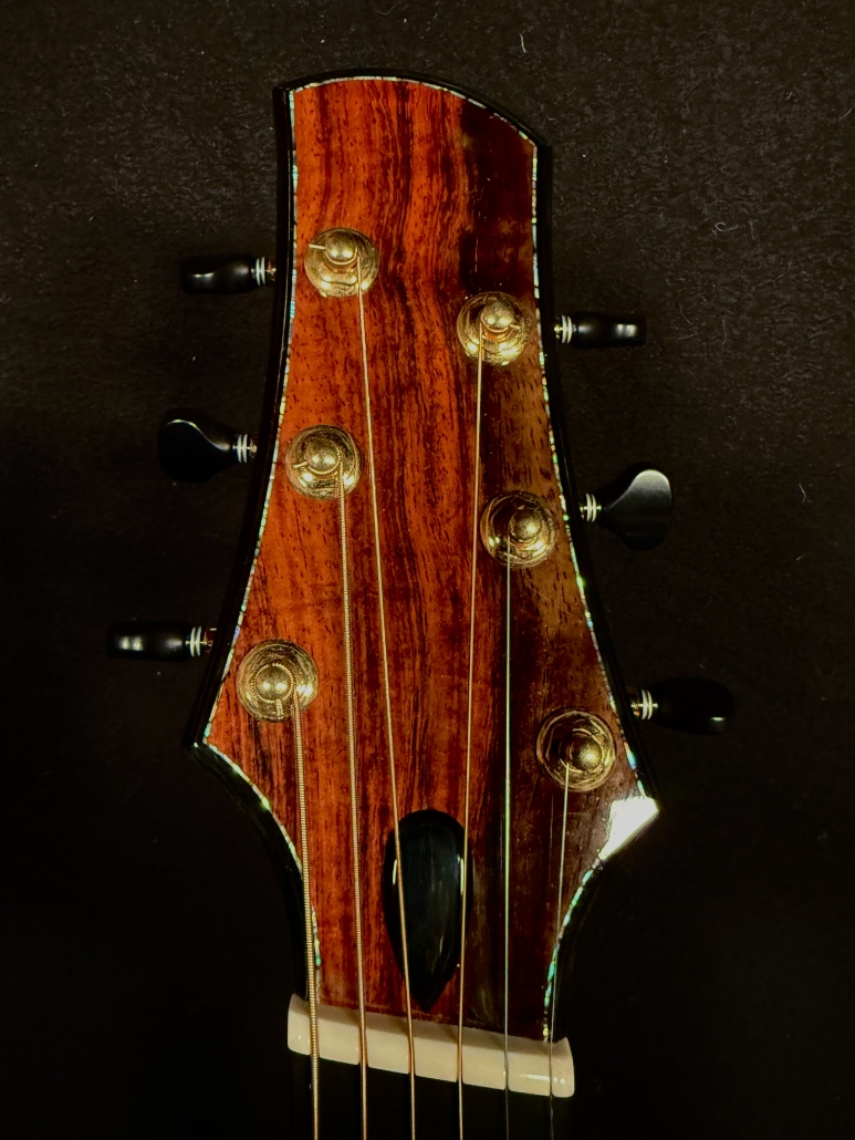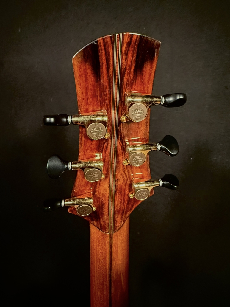 This Tom Doerr Solace Select with available stunning set of Brazilian Rosewood and a Adirondack Spruce top is a master piece of modern luthiery. It features an Arm bevel for comfort and a Multiscale for keeping those open tunings piano like even down to C. It has a big warm open voice with rich trebles that sustain forever. This is a lifetime keeper that will inspire. It’s in near mint condition.