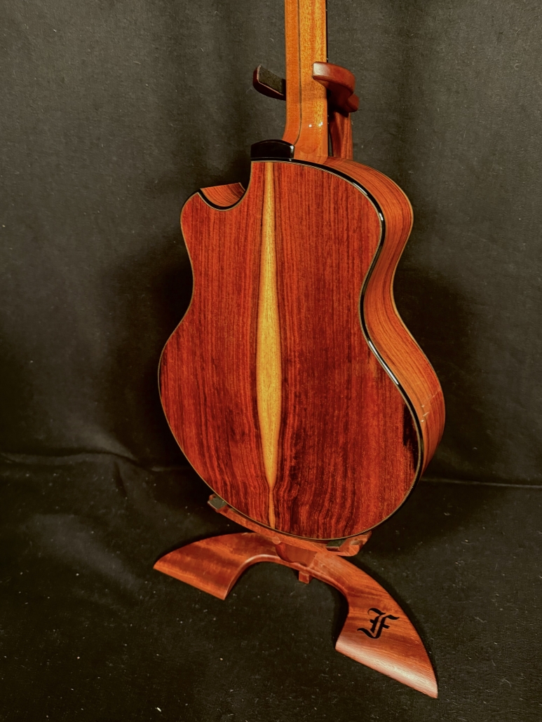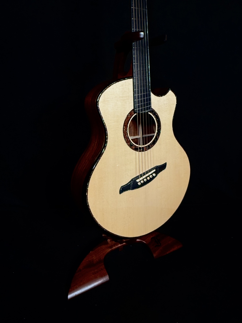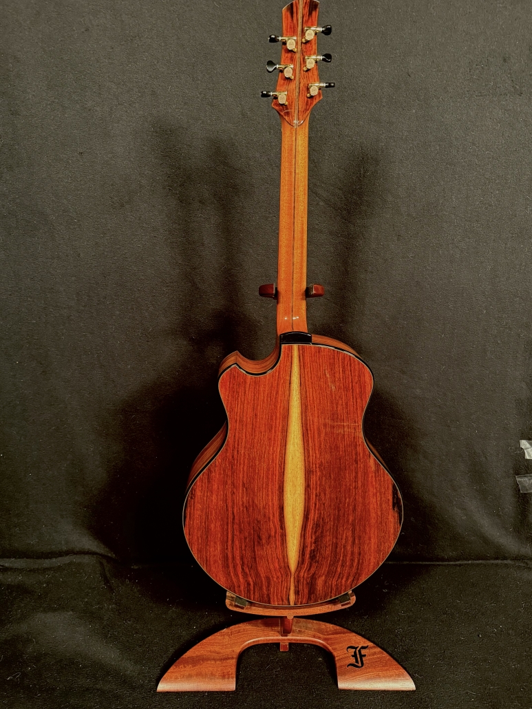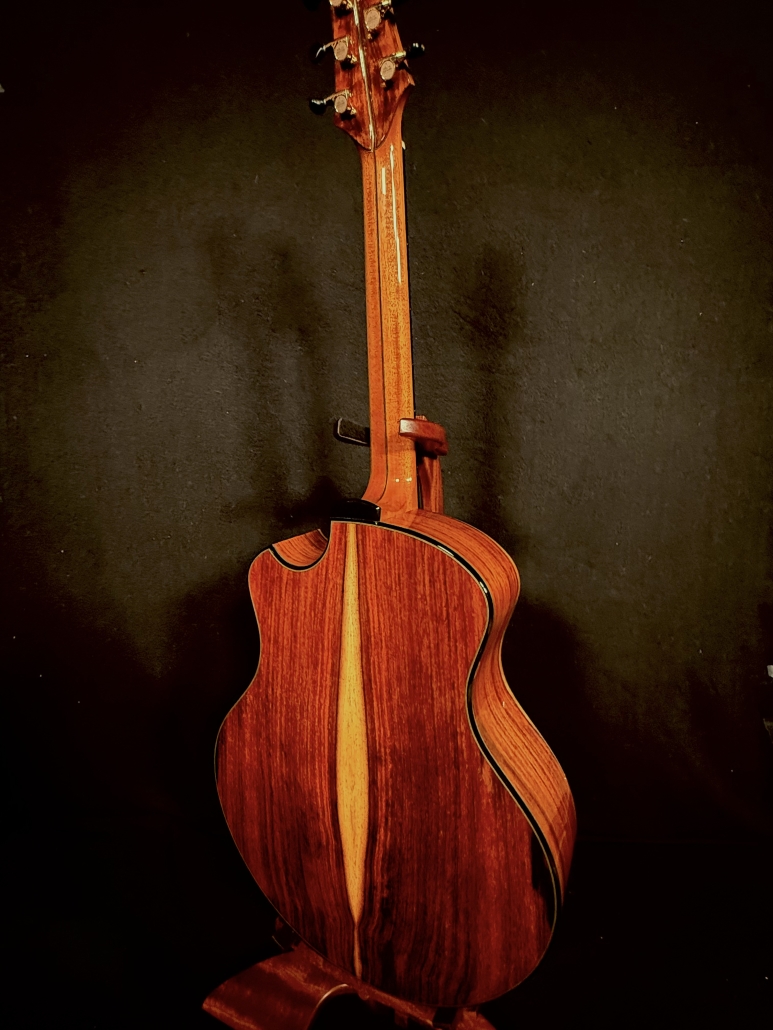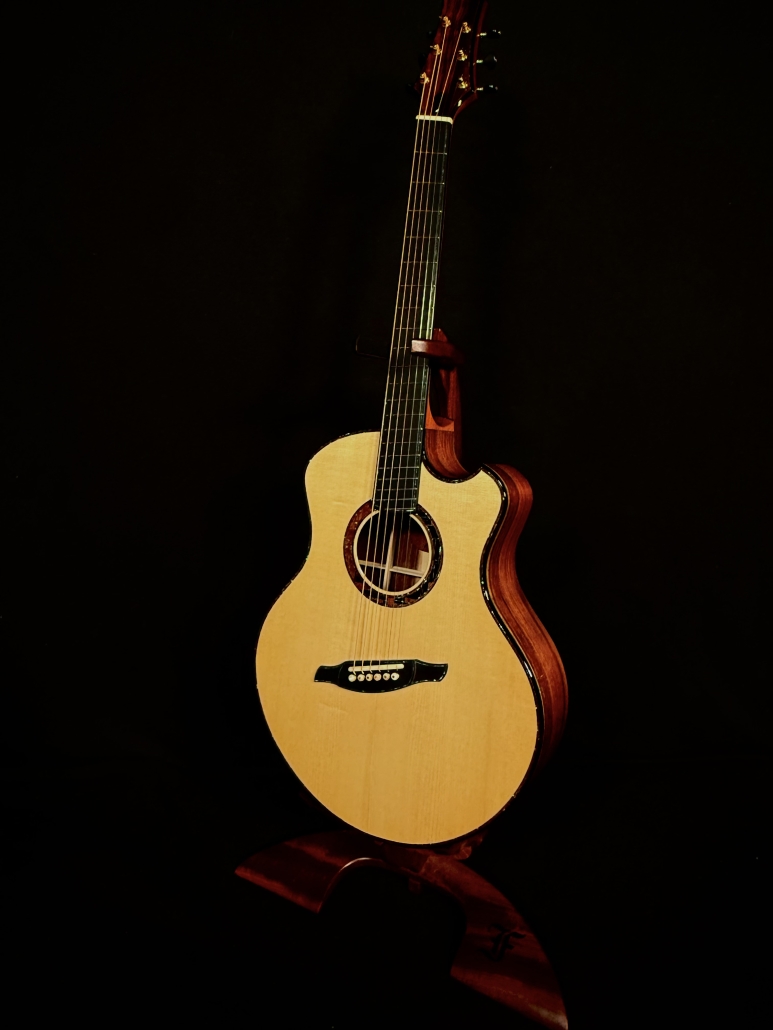 This Tom Doerr Solace Select with available stunning set of Brazilian Rosewood and a Adirondack Spruce top is a master piece of modern luthiery. It features an Arm bevel for comfort and a Multiscale for keeping those open tunings piano like even down to C. It has a big warm open voice with rich trebles that sustain forever. This is a lifetime keeper that will inspire. It’s in near mint condition.