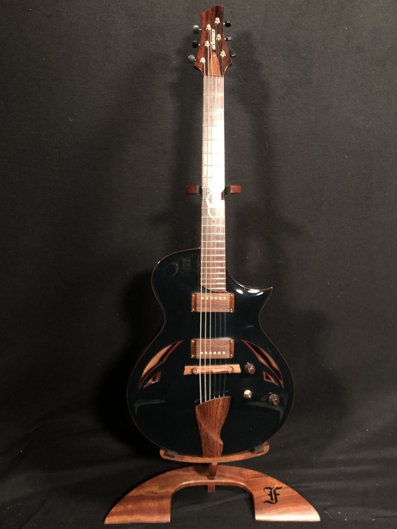I’m selling this fabulous Artinger Indrid Hollowbody with Mahogany back snd sides snd a Spruce top. It features custom Indrid fretboard inlay work by Larry Robinson. It features a Cocobolo fingerboard, tailpiece, bridge and bindings. It has Lollar pickups with custom Cocobolo wood covers. It also has Cocobolo knobs and switch cover and gold hardware. It is ultra lightweight at 5.5 lbs and is ultra responsive. It’s in excellent condition and comes with the factory hardshell case.