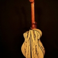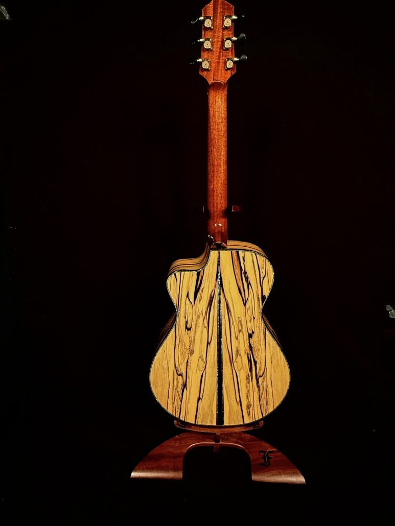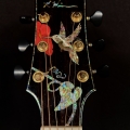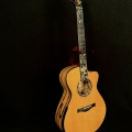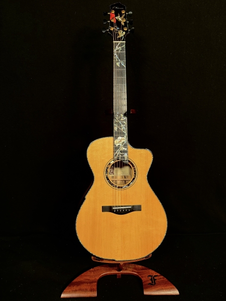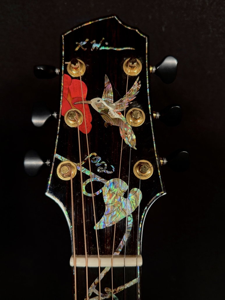 Kathy has done a gorgeous inlay on the fretboard and headstock and rosette. It’s in excellent condition and comes in a custom Hoffee flight case.