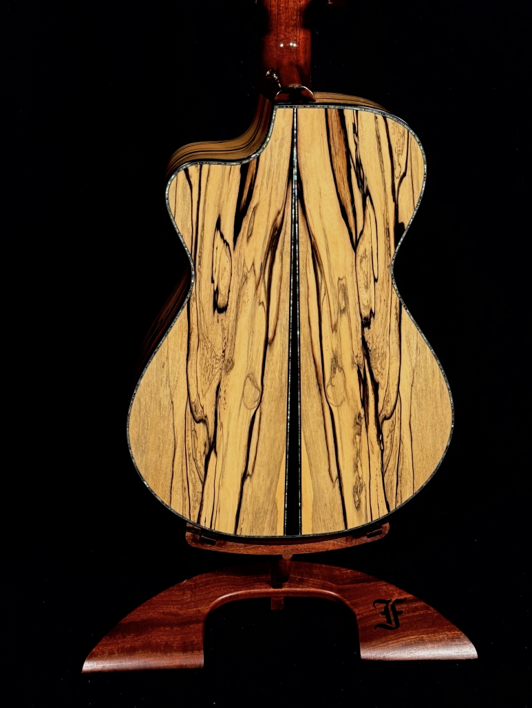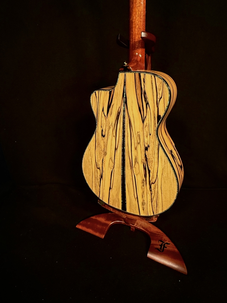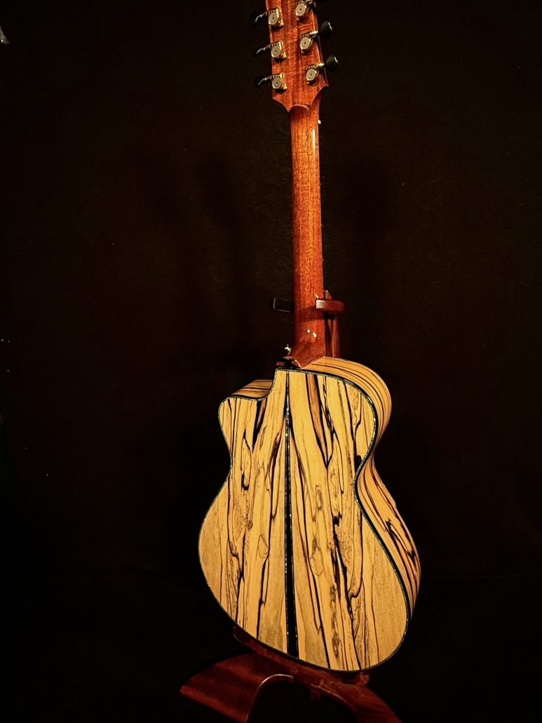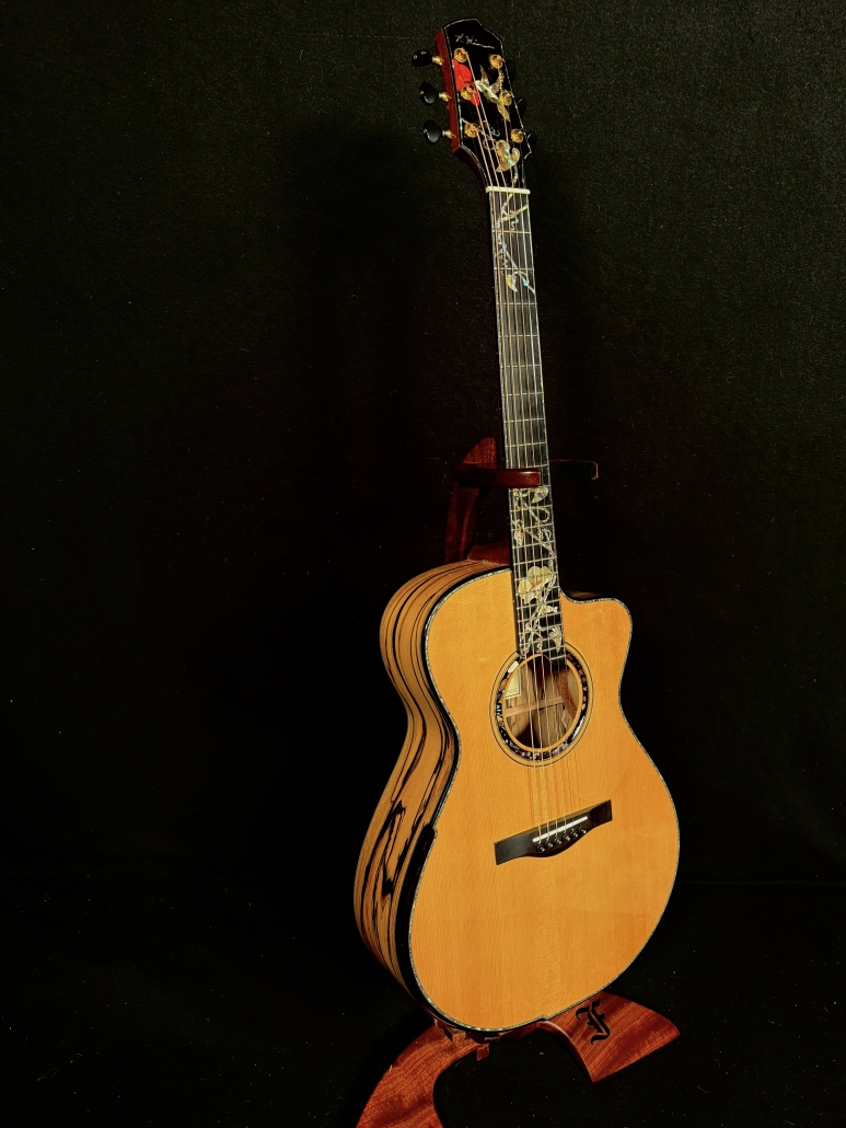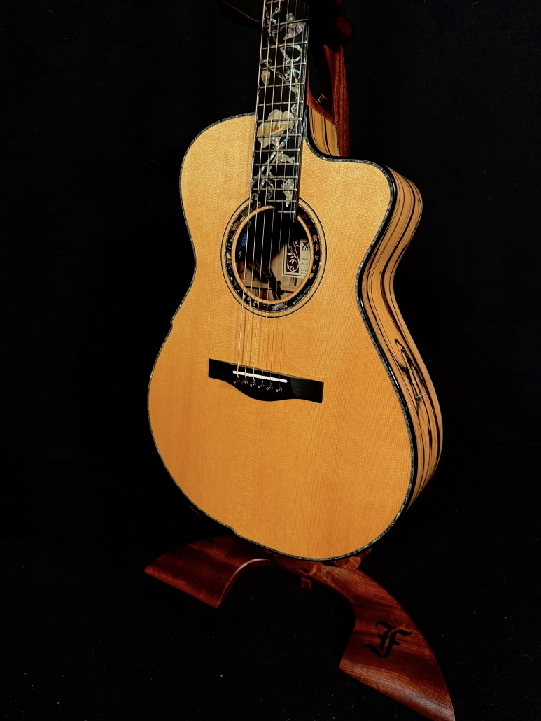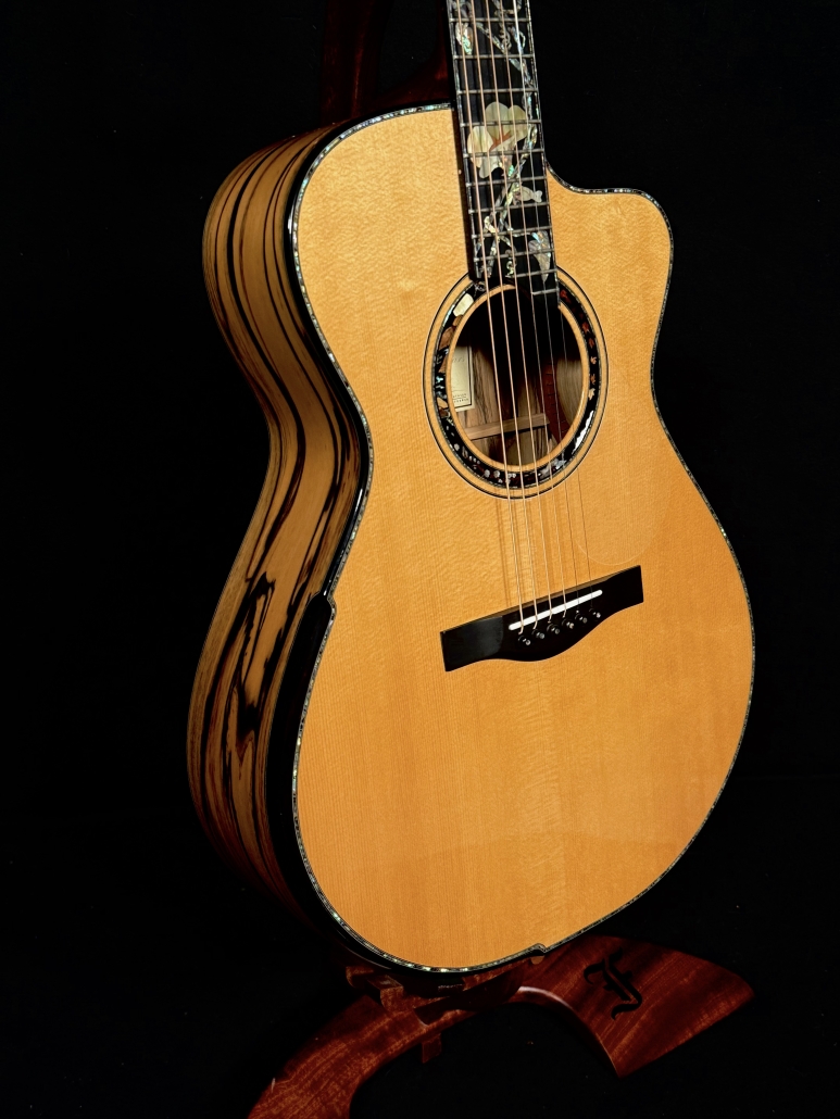 Just in to Cedar Rock is the stunning Kathy Wingert EVC with a beautiful set of Black and White Ebony for the back and sides and a German Spruce top. This Wingert EVC is ultra responsive with nice bass and trebles that sparkle.