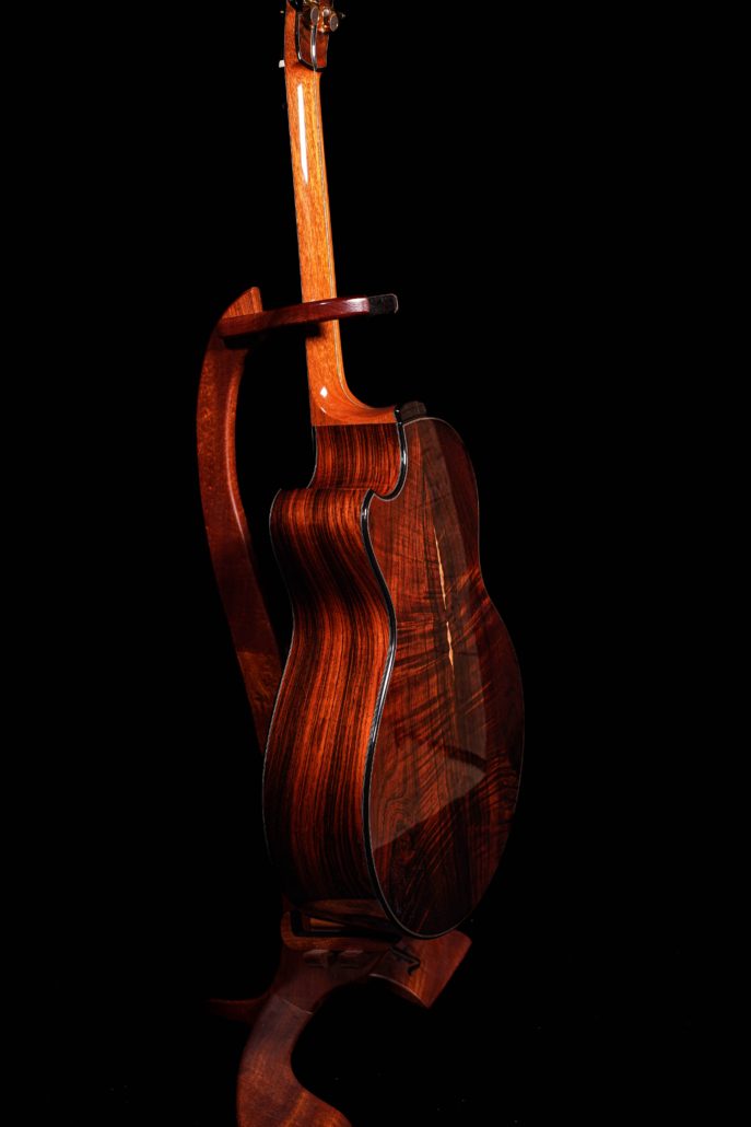 Tom Doerr had a gifted hand for crafting resonant, responsive modern acoustic guitar’s. This Trinity Select that just arrived is a prime example of his work. The attention to detail and finish is second to none.. Stunning Old growth Brazilian Rosewood for back and sides paired up with Swiss Moonspruce on top, plus an arm bevel and a florentine cutaway. The voice is detailed and powerful especially for a slightly smaller bodied guitar. The trebles are rich and round with no harsh frequencies at all. Tom’s skill in voicing the top to be extra quick responsive will inspire. It’s in mint condition.