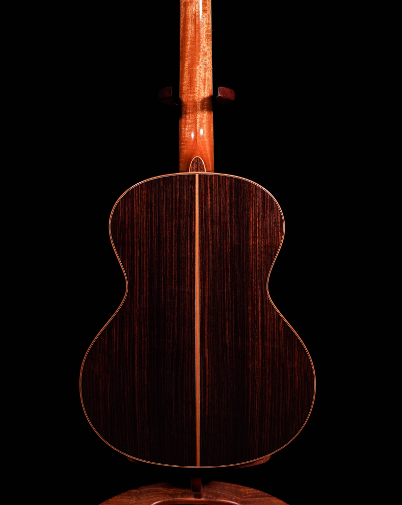 Just in at Cedar Rock is one of Petros best Fingerstyle guitars, the “FS”. Featuring a beautiful old growth set of East Indian rosewood back and side, with a very tight grained Engelmann Spruce top. This particular guitar is called the Studio/Stage, built specifically to sound stellar in the studio yet be a perfect sized guitar for the stage! Big, round trebles and bass, with a clear and silky midrange make for a wonderful playing experience.