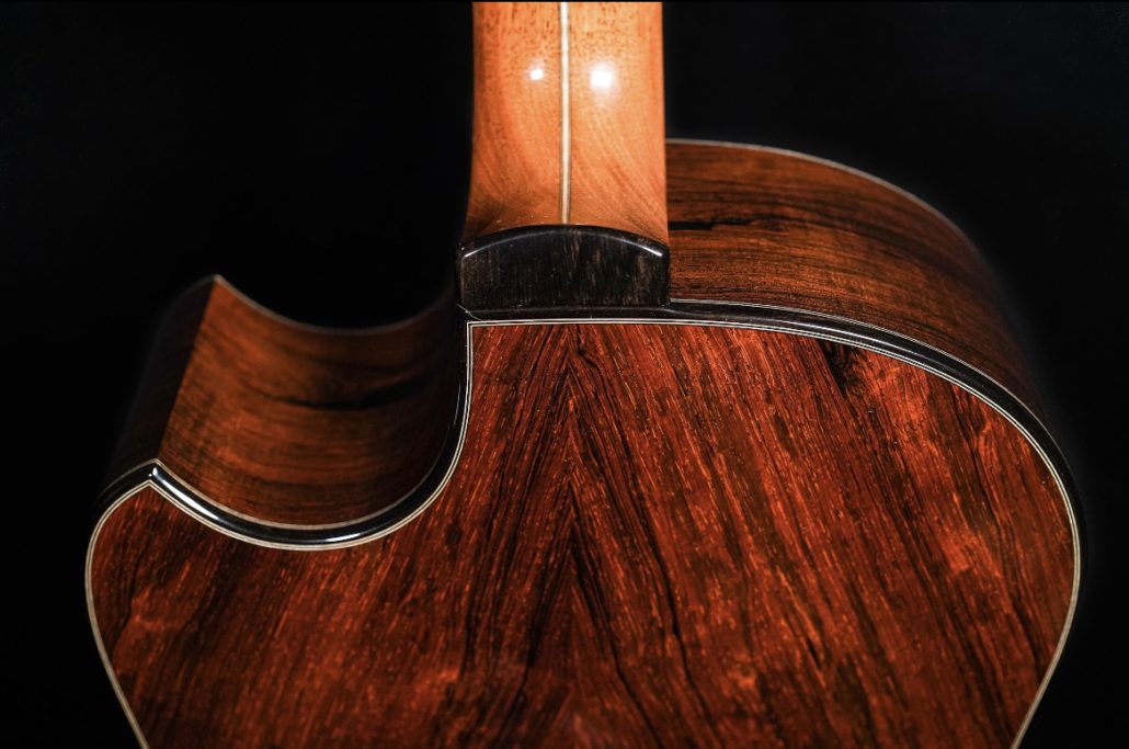 Here we have a very special and unique guitar that is unlike anything we have ever had pass through the shop. A guitar that somehow manages to bridge the gap between a thunderously-loud, large bodied tone while maintaining a sweet, open, lush midrange that a modern OM or even a 00 would have. Its a spectacle to hear and see where the bar has been set with this one in terms of what a modern, modified dreadnaught can offer. The headroom is just as impressive as its response to the lightest touch, truly a treat to play and hear from the other side. For those who don’t know, Tom took one of the last available Ervin Somogyi voicing courses earlier in his career and as a result learned how to make an extremely responsive guitar. The tops and active backs of his instruments work in harmony much like a drum and as a result the whole body feels alive on your lap.