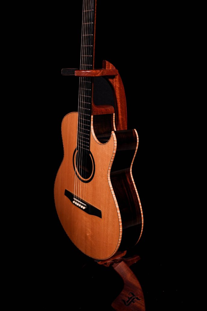 Just in to Cedar Rock is this fabulous 2020 Marchione OMC with a stunning set of Brazilian Rosewood for the back and sides and a Swiss Spruce top. You don’t see Brazilian like this nowadays. It features figured Maple bindings and hot hide glue throughout. Marchione installed his unique, five-piece piezo pickup system that he developed