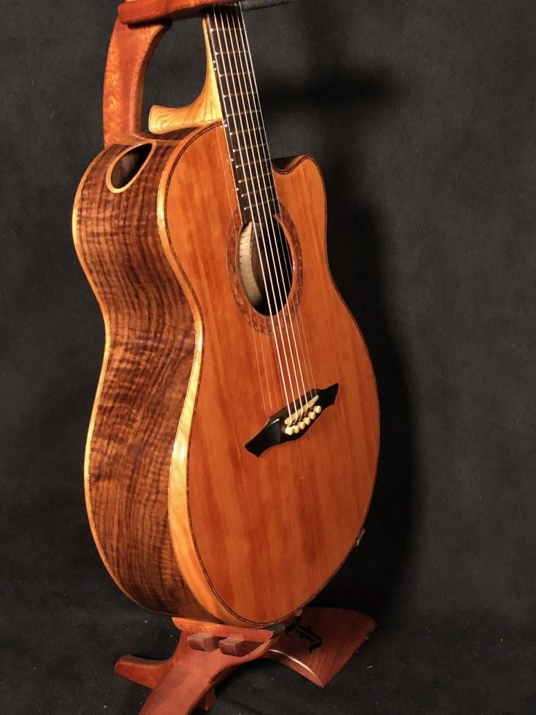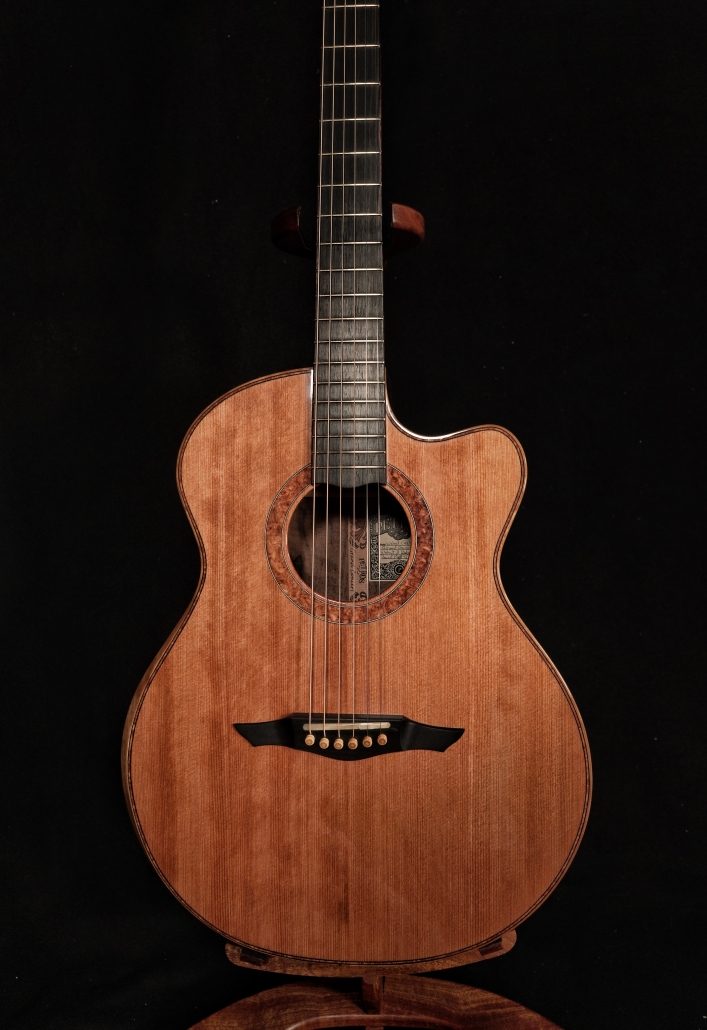 A superlative fingerstyle instrument with sweetness and woody tone to spare. This new Petros Grand Concert Cutaway has a flawless setup for ease of play and a smooth, luxurious Ryan-style bevel to boot. A soundport for giving the player a nice  listening monitor. This guitar is super light and ultra responsive. Fingerstyle arrangements in altered tunings inherit a wonderful, smooth complexity while playing this guitar. A real treat to the ears.