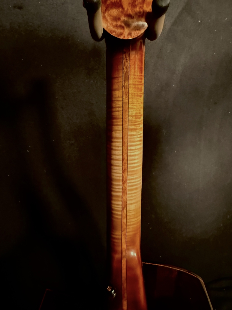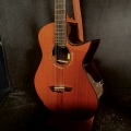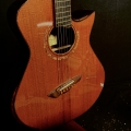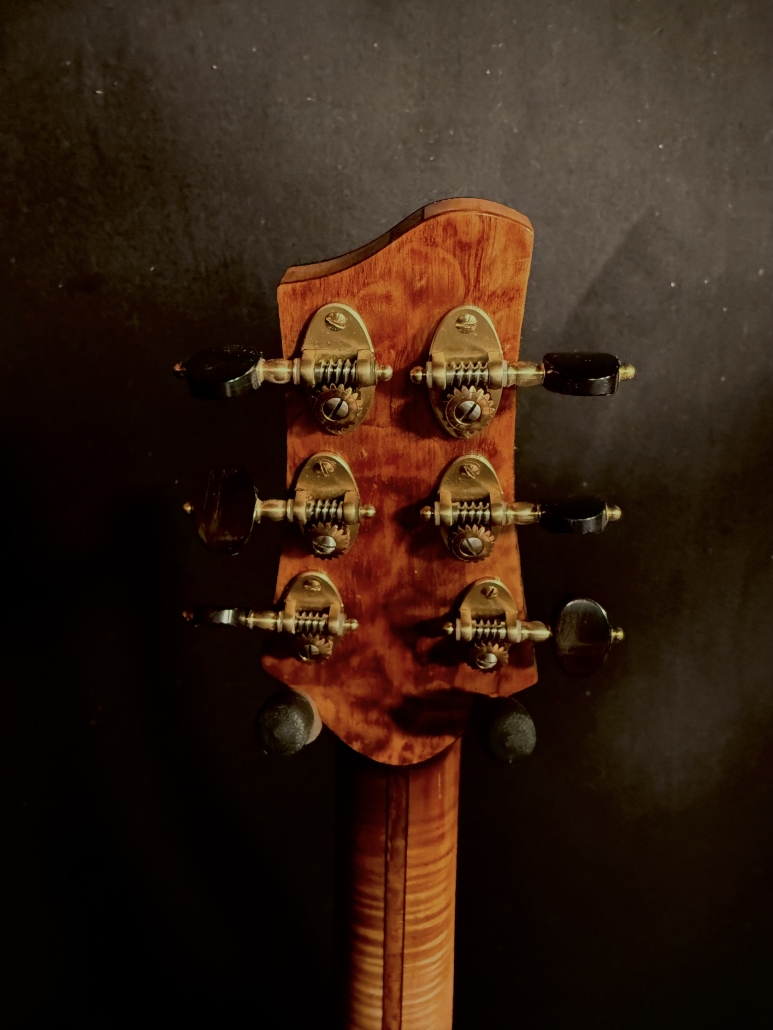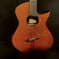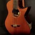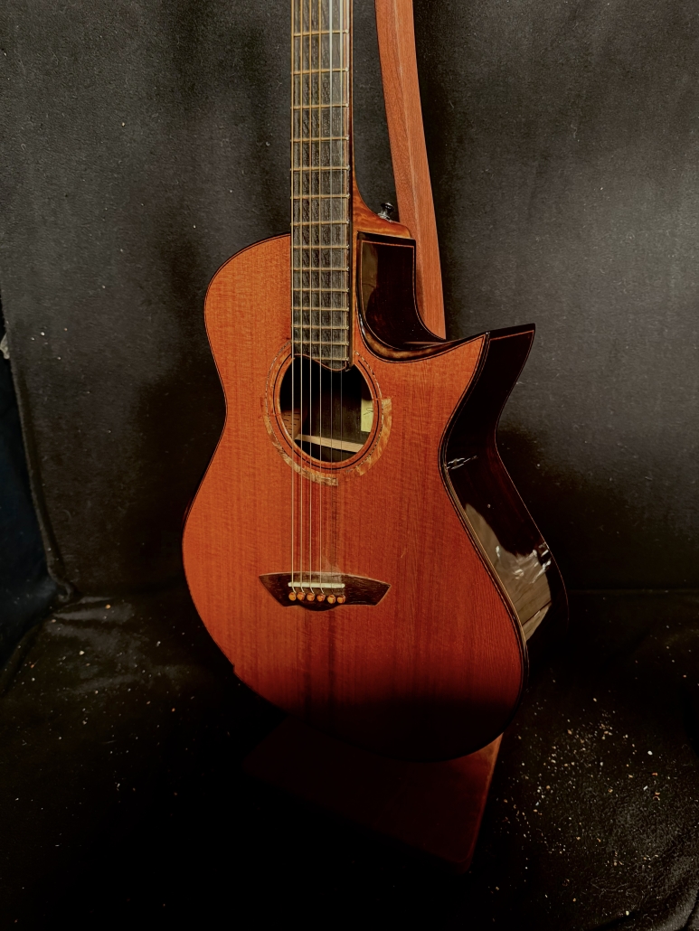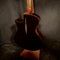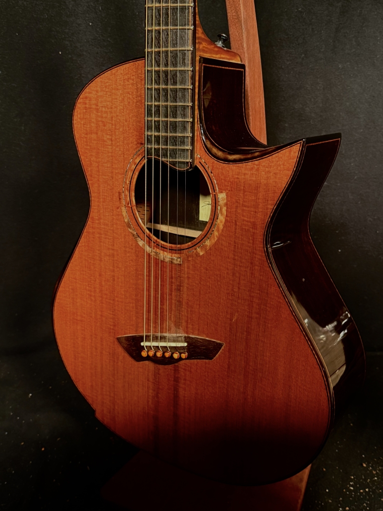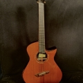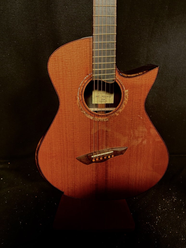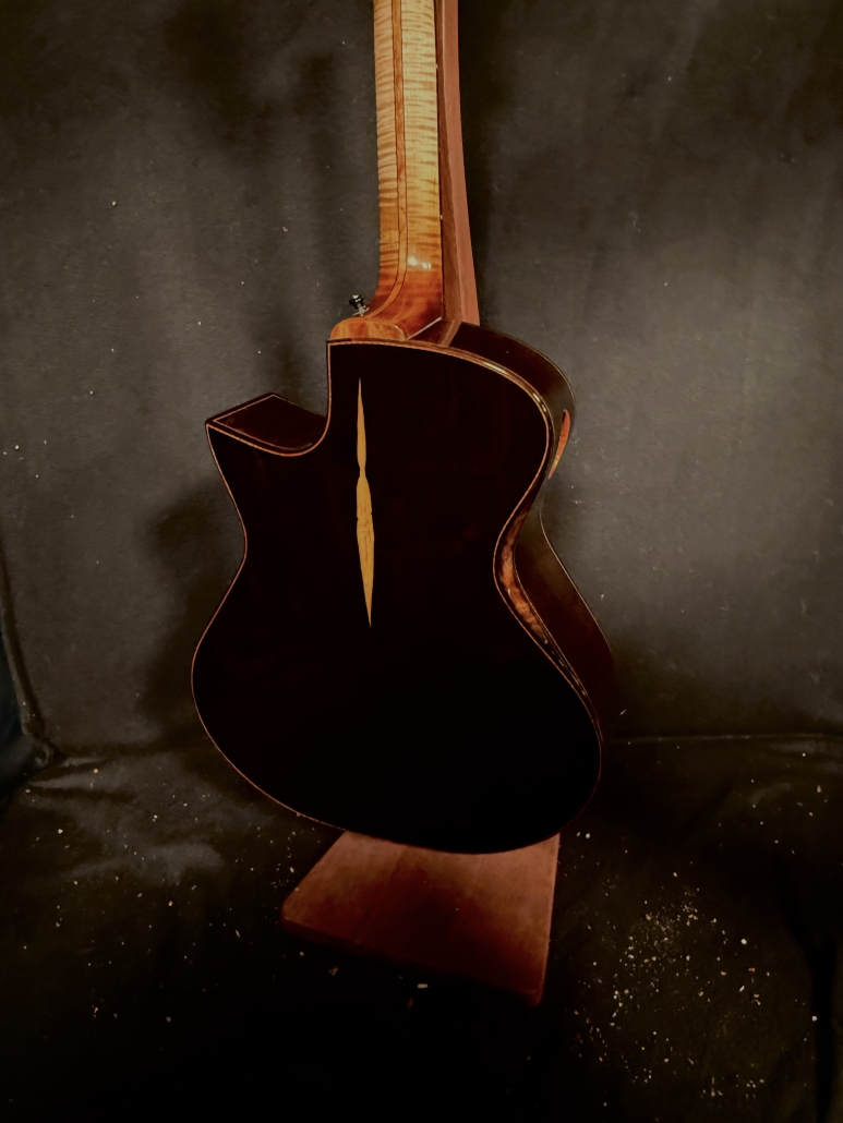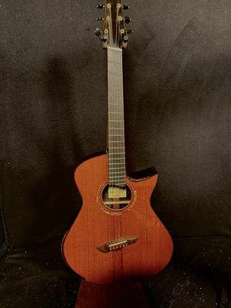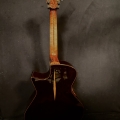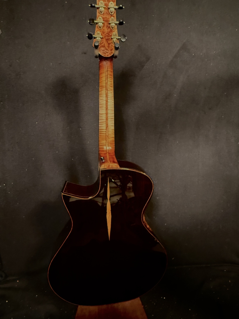 This is a John Kinnaird custom-made guitar with a brand new body shape known as the Graybeard. Even though its 16″ wide and 4.875″ deep it is very comfortable and feels like an OM due to the incorporation of various comfort features like the Arm Bevel, Rib Bevel and Manzer Wedge. On the cutaway, there is even a Finger Bevel! The multi-scale architecture runs from 25.75″ to 25.0″ and has the perpendicular f. Model Name: Graybeard Soundboard: Lucky Strike Redwood (Mastergrade) Back & Sides: African Blackwood with Sap (Mastergrade) Frets to body: 12 Scale length: 25.75″ to 25.0″ Nut Width: 1.71875″ (23/32) String Spacing: 2.25″ Neck: 5 piece (Flamed Maple with Quilted Maple Center Strip) Neck Profile: Slim, Asymmetric C/V Fingerboard: Ancient Bog Oak Bindings: Brazilian Rosewood with Quilted Maple fade on bevels Purflings: Curly Mahogany from The Fiddleback Tree Headplate: Ancient Bog Oak Backstrap: Quilted Maple Tuners: Alessi with Buffalo Horn Buttons Bridge: Custom Brazilian Rosewood Bridge Pins: Amber Bone (Bob Colosi) Nut: Fossilized Walrus Ivory Saddle: Fossilized Mammoth Ivory Fretwire: EVO Gold Rosette: Custom Segmented Quilted Maple, Fiddleback Mahogany, Brazilian Rosewood & Abalone End graft: Quilted Maple fade Heel Cap: Quilted Maple Soundport: Bound in Fiddleback Mahogany Soundhole: Bound in Quilted Maple Options: Arm Bevel, Rib Bevel, Finger Bevel, Florentine Cutaway, Multi-scale, Elevated and Cantilevered Fingerboard Body Finish: High gloss Catalyzed Urethane (Tony Ferguson) Neck Finish: Satin Nitro (John Kinnaird) Electronics: K&K Pure Mini