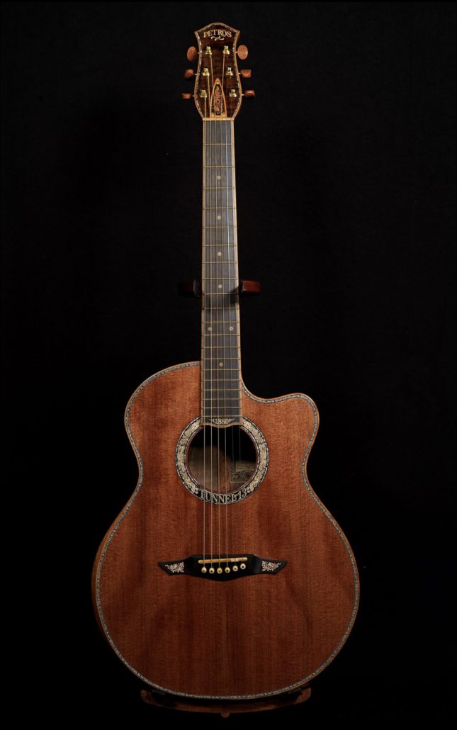 Just in to Cedar Rock from a. Private collectors immaculate collection, is this 2021 Petros Grand Concert with a stunning set of Claro Walnut back and sides and a Tunnell 13 Redwood top from 1880. It has a voice that is bold with rich lows with trebles that are silky and very clear. It is in like new condition.