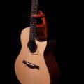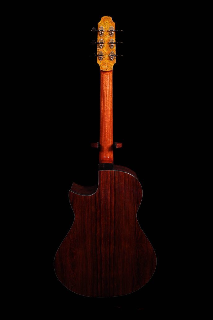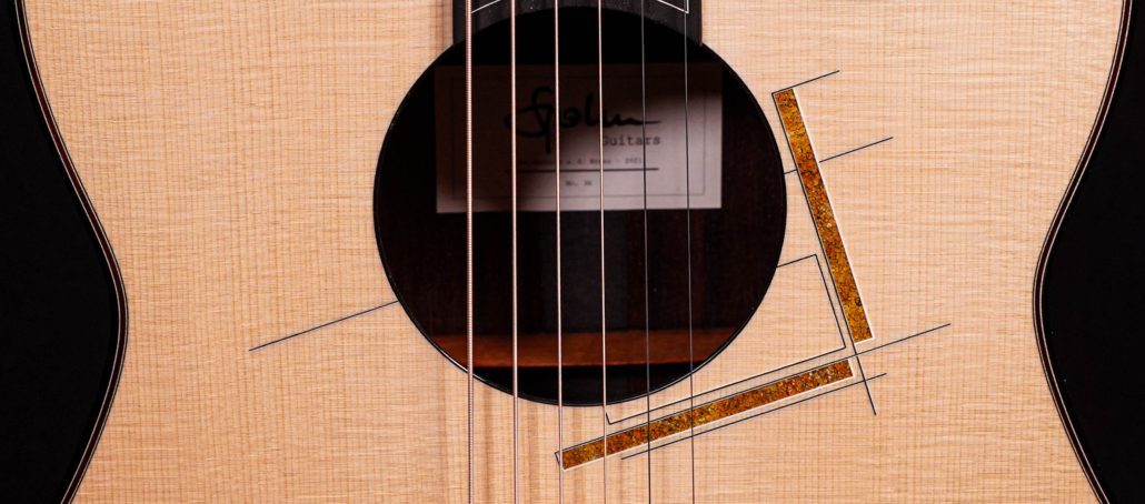The second Spohn to come into Cedar Rock has yet again knocked it out of the park! Featuring a menacing set of Madagascan rosewood with beautiful dark, inky lines. A very clean Swiss Moon Spruce top with a special treat of ornamentation throughout. Max goes on mountain hikes nearby, and found this gorgeous Lichen that he collected, stabilized, and inlayed into the guitar- Rosette, Headcap, and entire Backcap! The MDC is a larger guitar, but to make is easier on the player… Max has included a Manzer wedge in this build. The icing on the cake is the wider finger style specs- 1.79” nut and 2.28″ saddle.