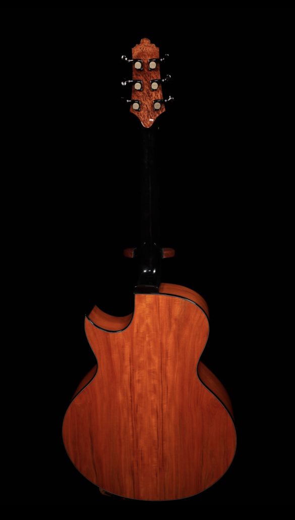 We have in another great guitar from world renown luthier Mario Beauregard. This one is a SJ model featuring a stunning set of South American Pernambuco and a European Spruce top. Stunning in its orange hue, South American Pernambuco sets are very hard to come by nowadays. Often compared to Brazilian rosewood, it has a vibrant voice with sparkling highs with a well rounded bass with unreal sustain. This SJ is sweet and sustaining, with just the right amount of chime in the trebles, clear in the midrange and a solid bass. It’s a beautiful complex tone that is perfect for fingerstyle or for flat picking. This is a world class level guitar from one of the top luthiers in the world. It is in mint like new condition.