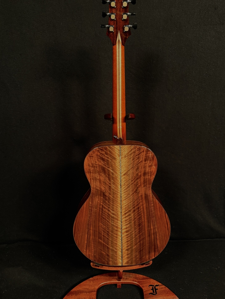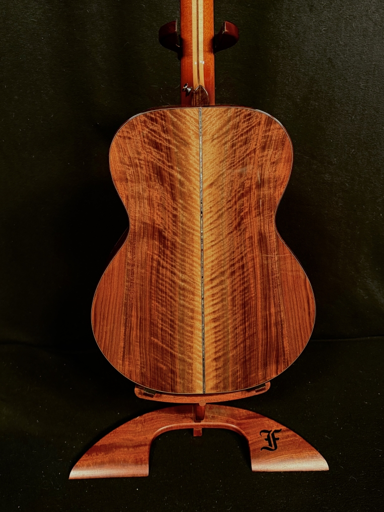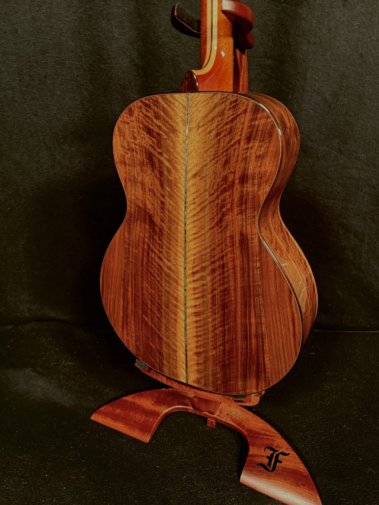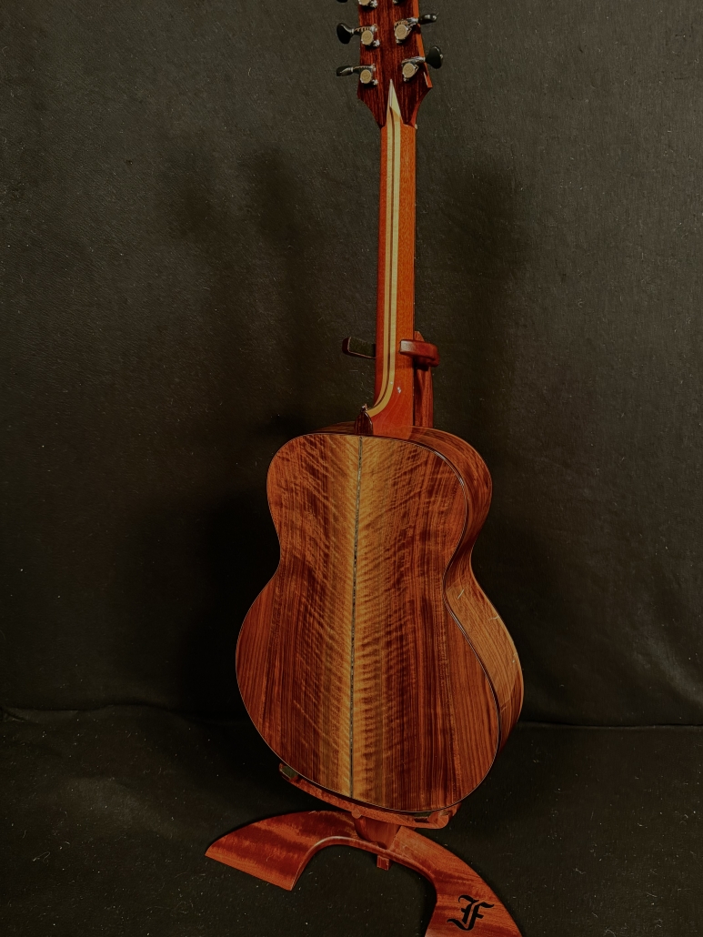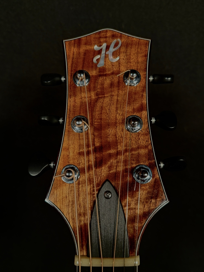 Drew Heinonen has built a masterpiece here with this SJ with figured Walnut and Alpine Spruce for the top. This guitar was featured at the Fretboard Summit in Chicago in 2023 so you know Drew pulled out all the stops for this build. The walnut adds a richness to the notes and the Alpine Spruce enhances the trebles with tremendous clarity. It’s near mint condition and comes in a Calton flight case.