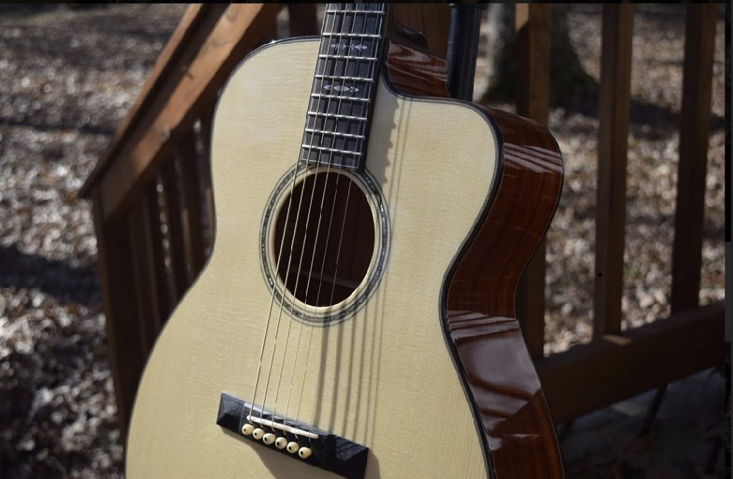 These Dana Bourgeois soloist guitar’s are among the best fingerstyle guitars available today and this one is no exception. This one has beautiful Padauk back and side wood with a Italian top. This guitar has clarity and detail to every note and the harmonics ring out effertlessly.