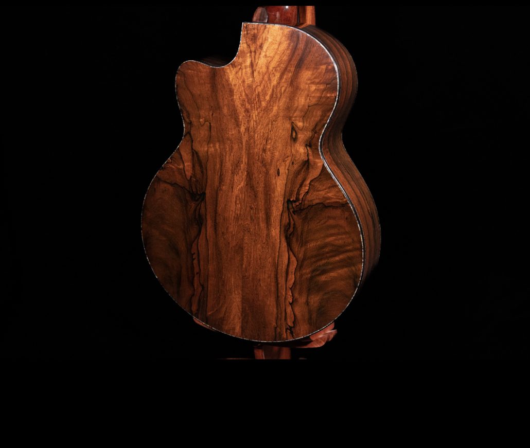 This Ryan Nightingale Signature is one of the richest sounding guitars we have ever had here at Cedar Rock. The low mids and the overtones that blanket them are exceptional sounding, and the Brazilian Rosewood really gives the voice an ethereal character. This guitar excels most on ballads where the sustain can be appreciated and dropped tuning pieces where the overtones can blend and create harmony or dissonance that will enhance the song. This is a Custom order Signature model loaded with so many great options. The depth of the lower bout was custom ordered to be a half inch less in depth to make it 4.25 making this one feel so much more comfortable. We highly recommend listening with headphones to appreciate the massive sound that comes from this guitar!