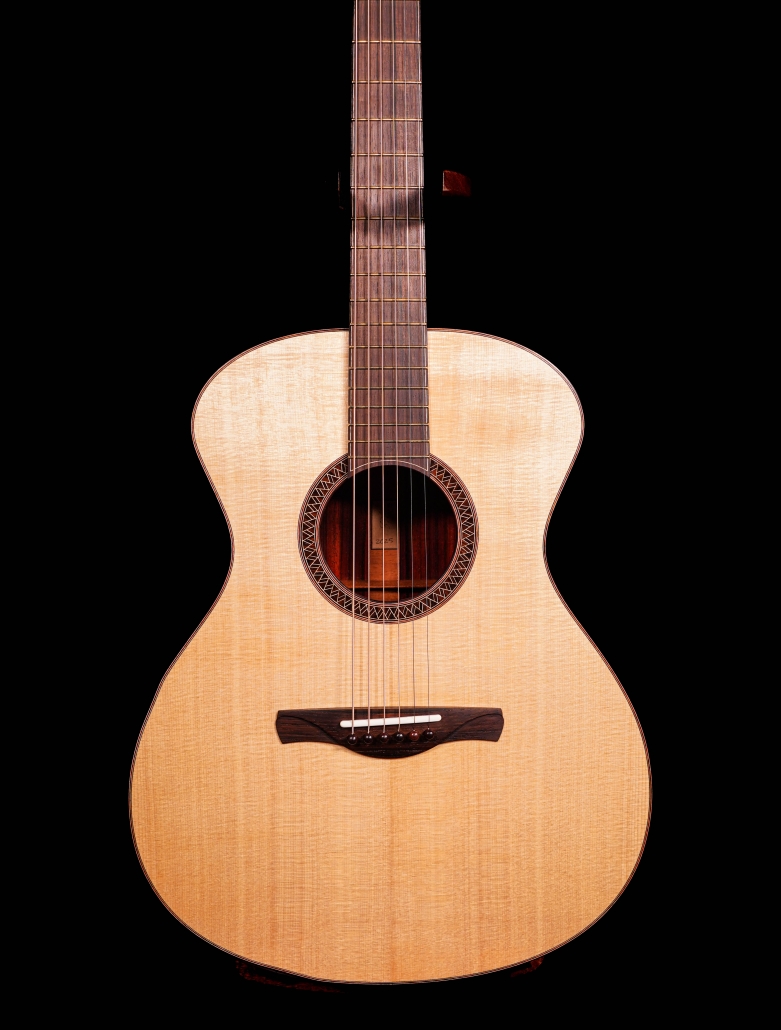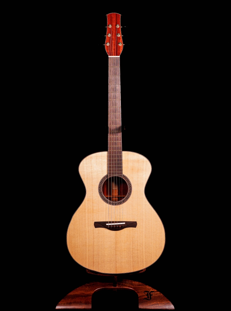 Brand new arrival at Cedar Rock is this 2025 Ryan Gerber RL16 in Padauk, topped with a Swiss Spruce soundboard. Madagascan Rosewood fretboard and bridge, and body bound in Cocobolo. Perfectly voiced, ultra resonant, and a tung oil urethane for a very thin and durable finish. This Padauk was one of Ryans favorite sounding woods in his shop, and we can hear why! This is one of Matts favorite guitars he has encountered at Cedar Rock.